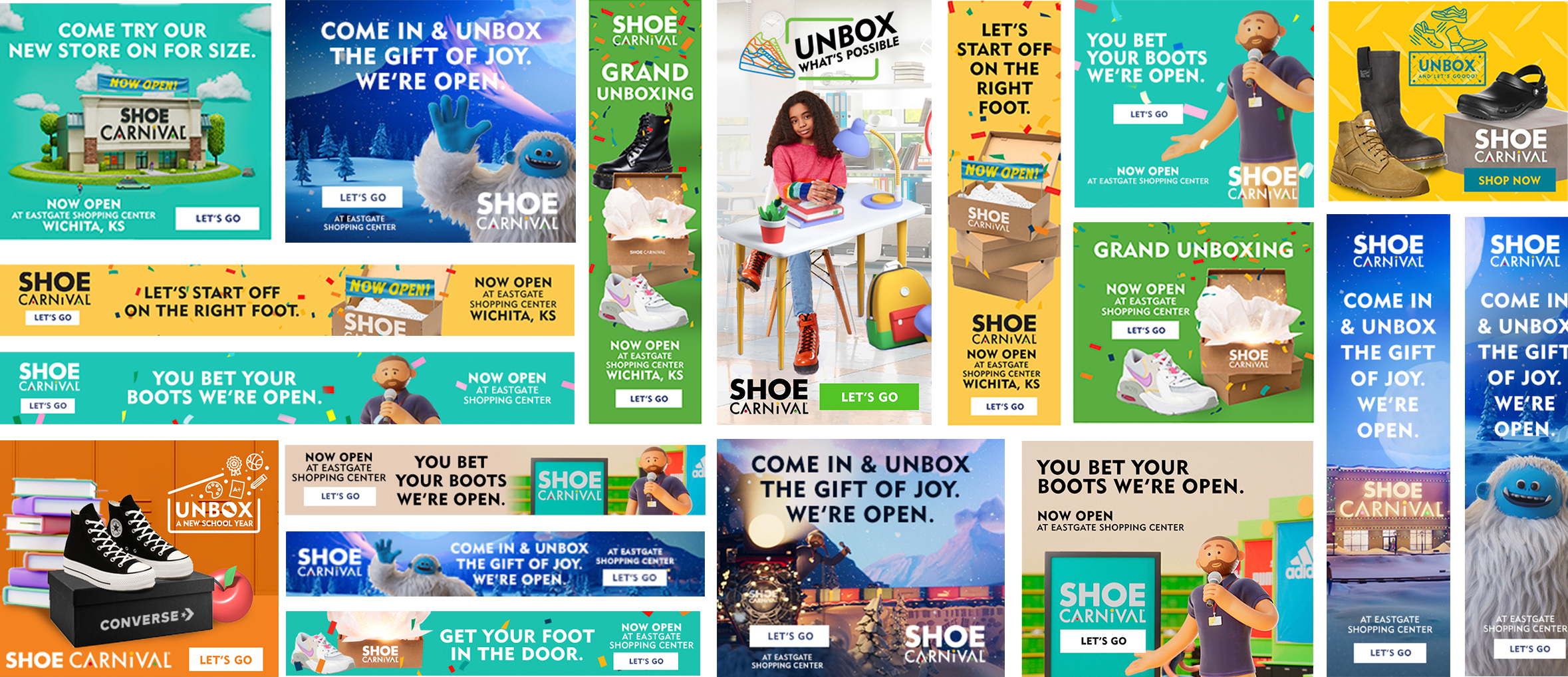 We built a full-on unboxing universe for Shoe Carnival—starting with Back-to-School and running straight through winter. Each shoe had its own world, and we brought it to life (literally). From concept to execution, it was all about turning that first shoe reveal into a moment.